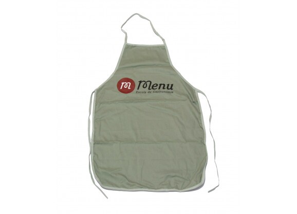 Avental promocional produzido em brim 100% algodão, com alça de pescoço regulável e alças para amarrar.