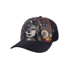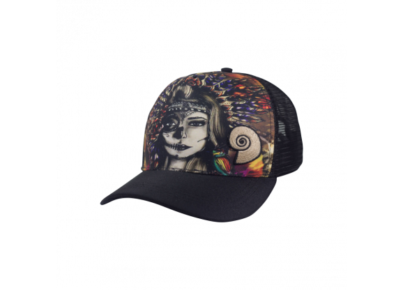 Boné Trucker confeccionado em tecido Supercap 100% Poliéster, botão de metal encapado, regulador de plástico 1 pino, aba com 4 costuras.