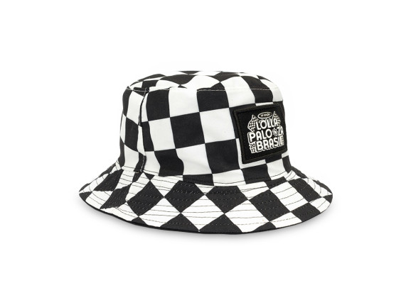 Chapéu bucket personalizado dupla face Preto e Xadrez, produzido em brim e microfibra com personalização dos dois lados.