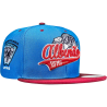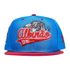 Boné modelo Snapback azul turquesa com aba vermelha, confeccionado em tecido Supercap 100% Poliéster, botão de metal encapado, regulador de plástico 1 pino, aba reta com 4 costuras e ilhós bordado em todos os gomos